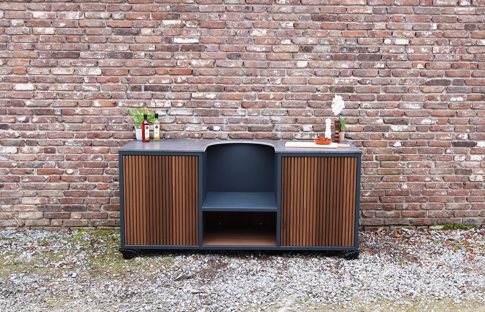 Een prachtige combinatie van 3 cm staal met duurzaam Thermo hout. Dit hout is extra duurzaam en perfect voor het bekleden van buitenkeukens.