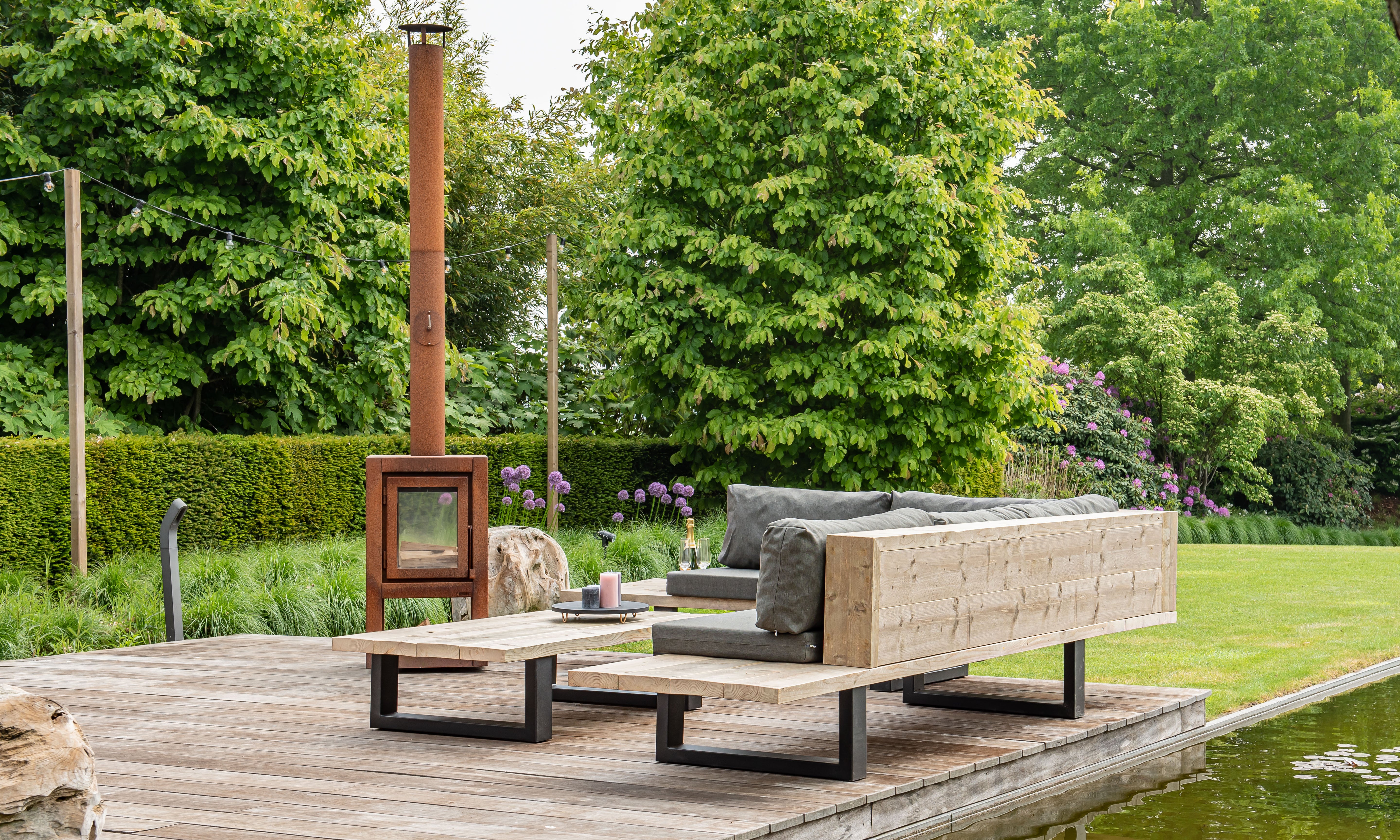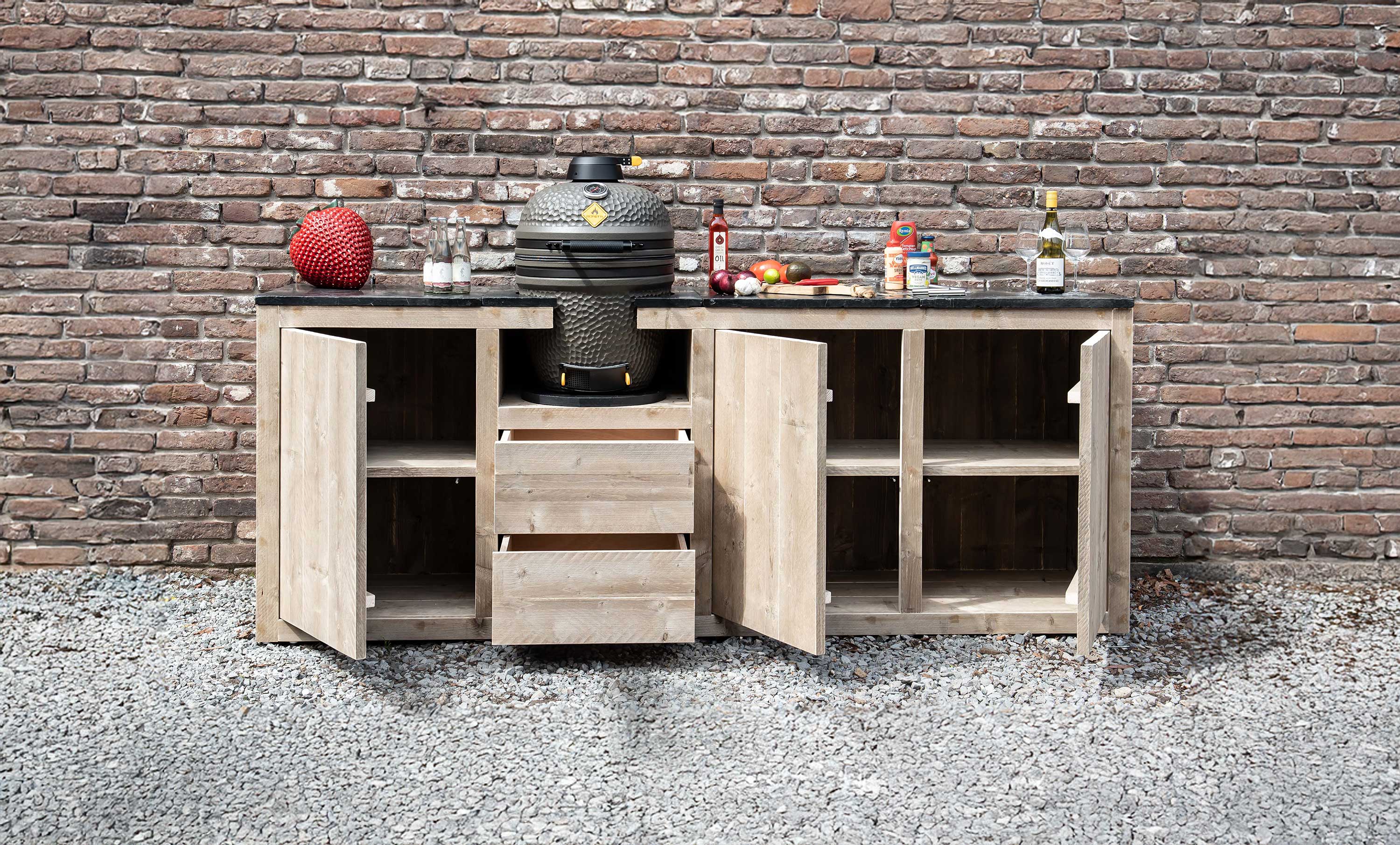 Stel jouw eigen buitenkeuken samen. Bepaal zelf de indeling, houtsoort en het blad.